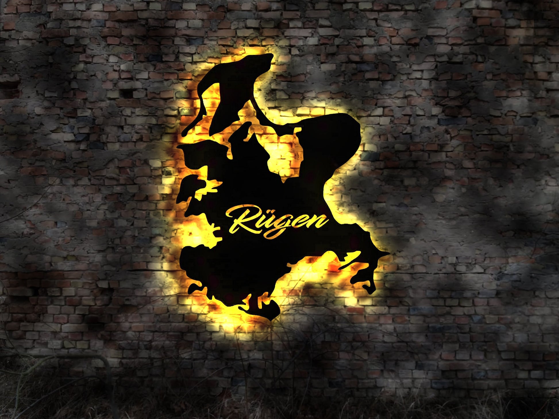 Skyline Insel Rügen Ostsee LED Wandbild Holz Stadt Karte Map Stadtplan Wandsticker Leuchtbild Neonreklame Wandtattoo Reiseführer Silhouette