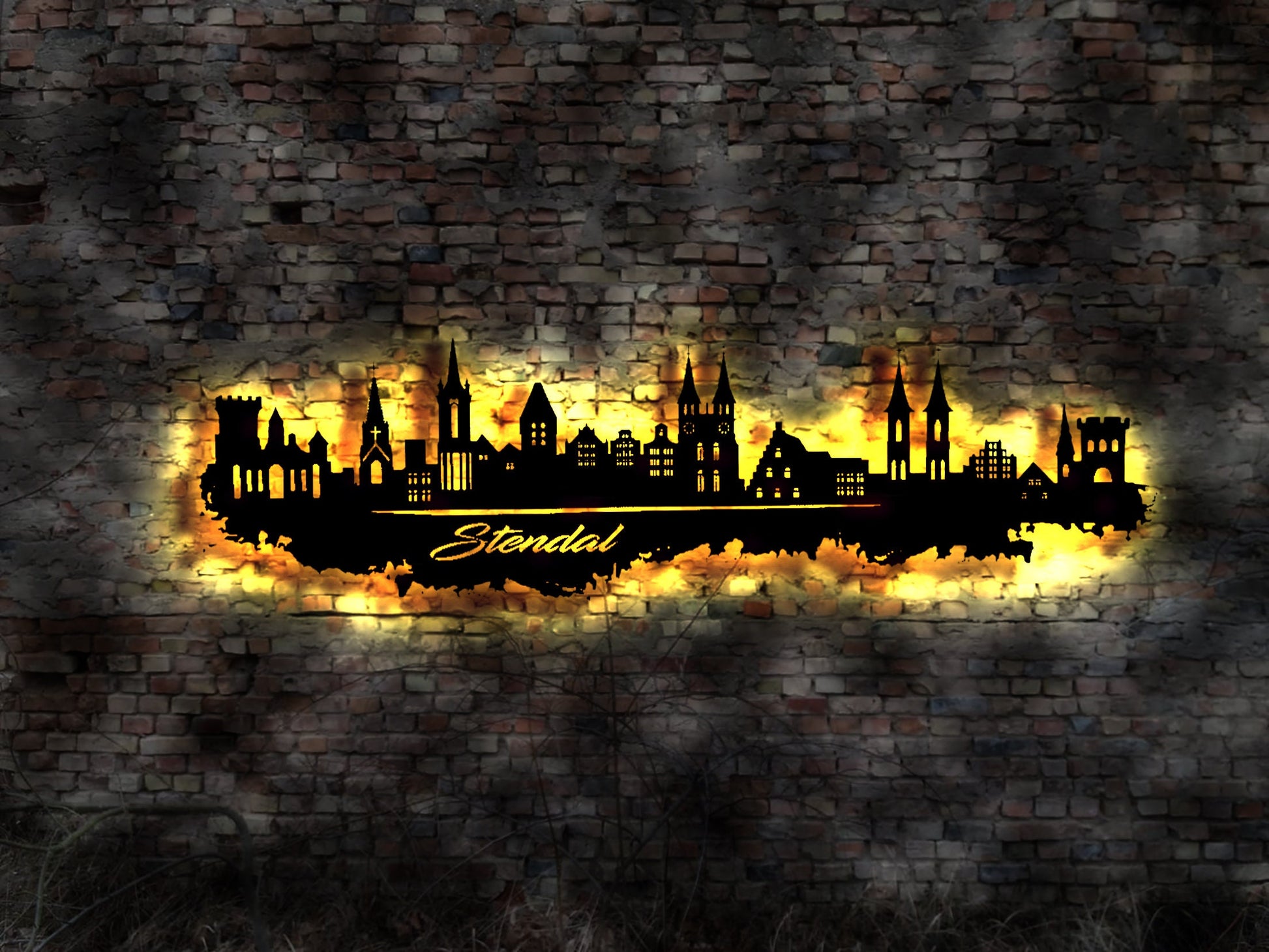 Skyline Stendal LED Wandbild Holz Stadt AK Karte Map Stadtplan Wandsticker Leuchtbild Neonreklame Wandtattoo Reiseführer Silhouette