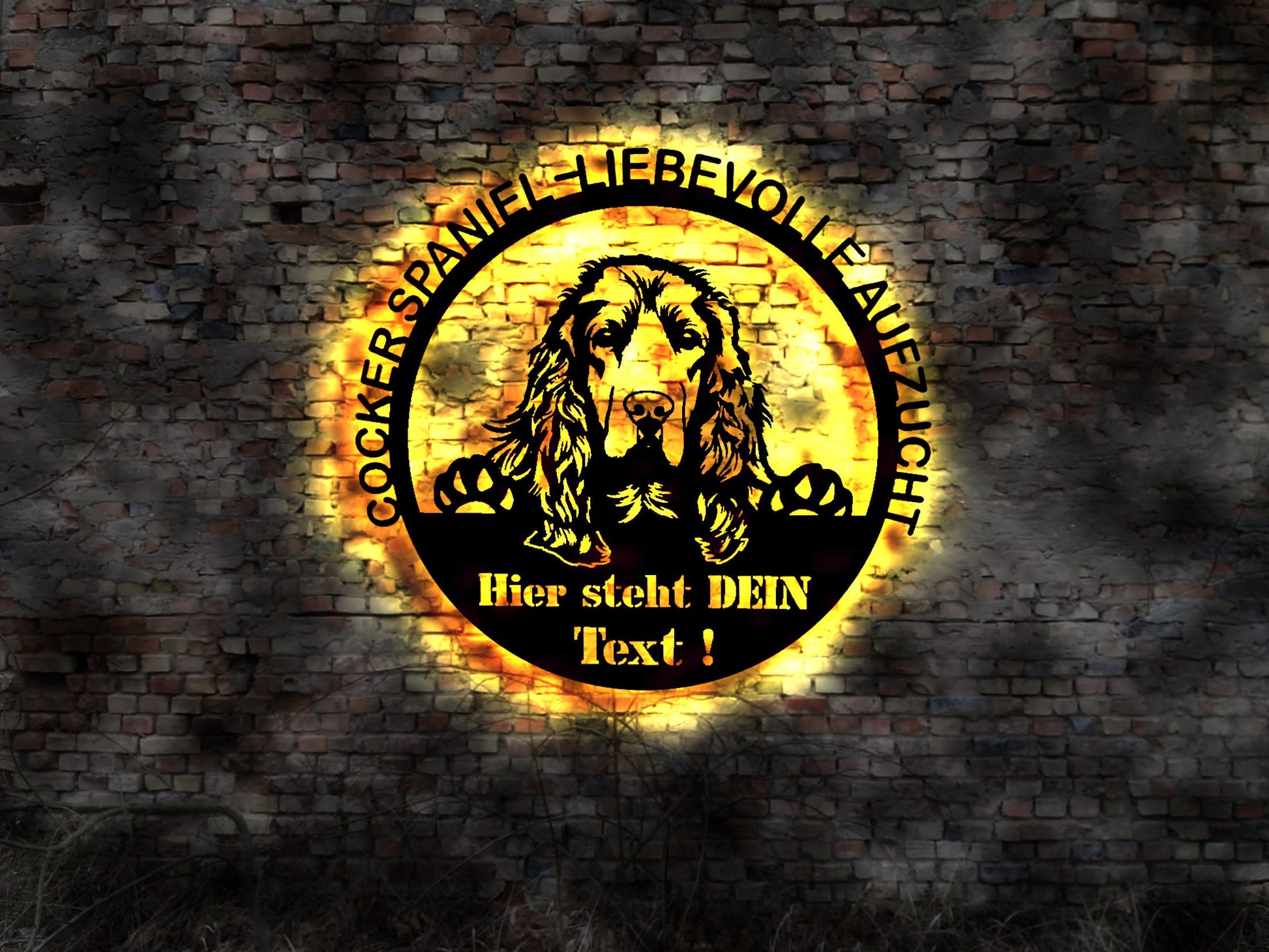 Aufzucht Cocker Spaniel LED Wandbild aus Holz Welpen Welpe Buch Hund Dog Zucht Züchter Geschirr Futternapf Leine Leckerlies Halsband