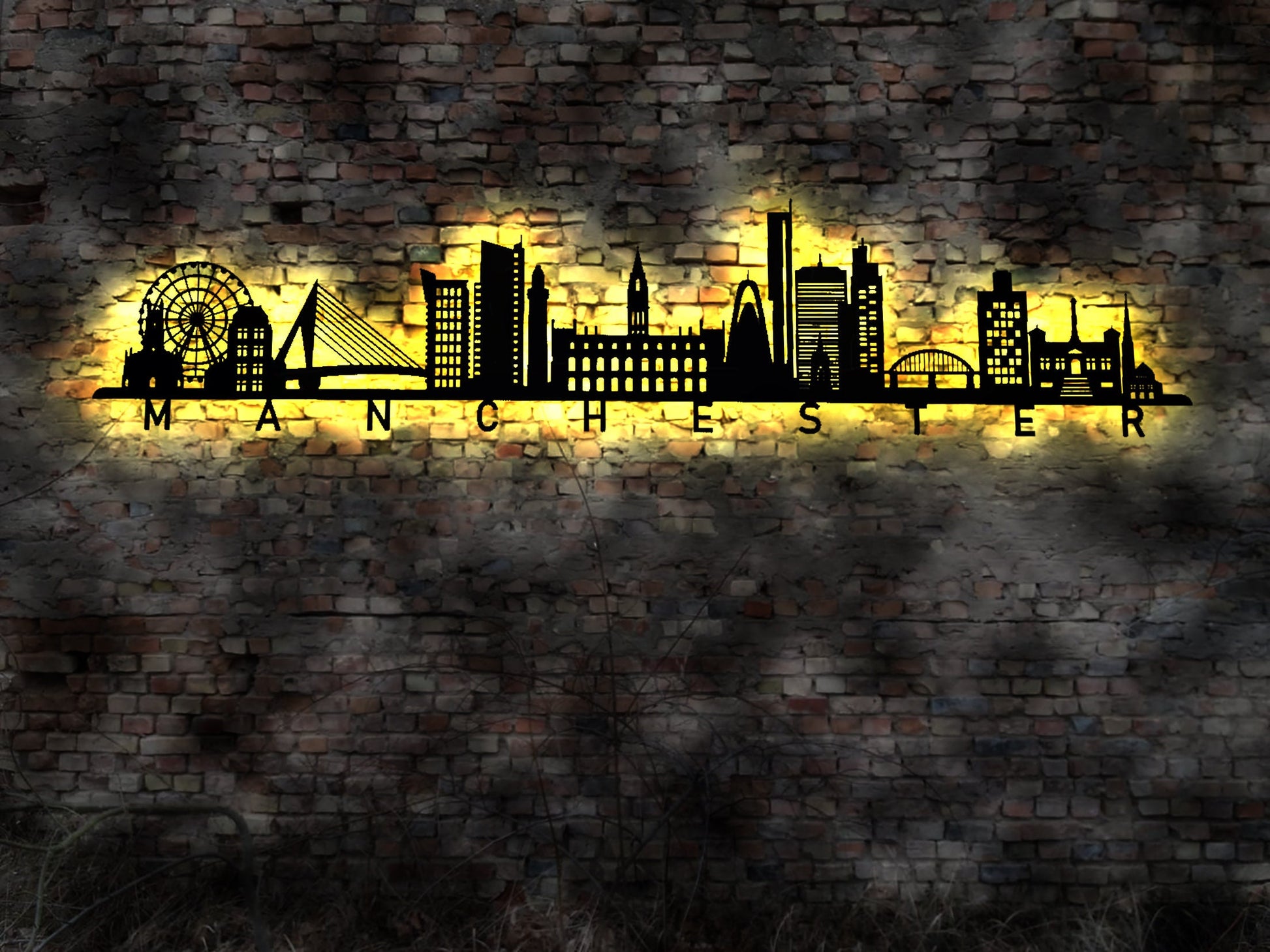 Skyline Manchester LED Wandbild Holz Stadt AK Karte Map Stadtplan Wandsticker Leuchtbild UK Wandtattoo Reiseführer Silhouette