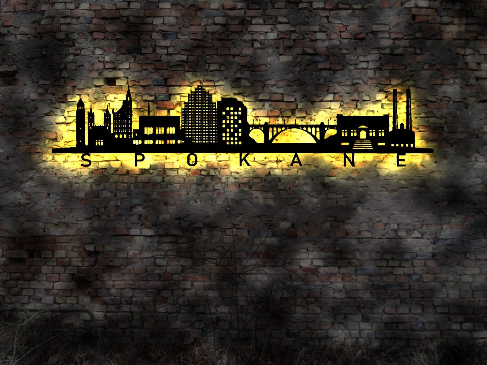 Skyline Spokane Stadt LED Wandbild Holz Stadt AK Karte Map Stadtplan Wandsticker Leuchtbild Neonreklame Wandtattoo USA
