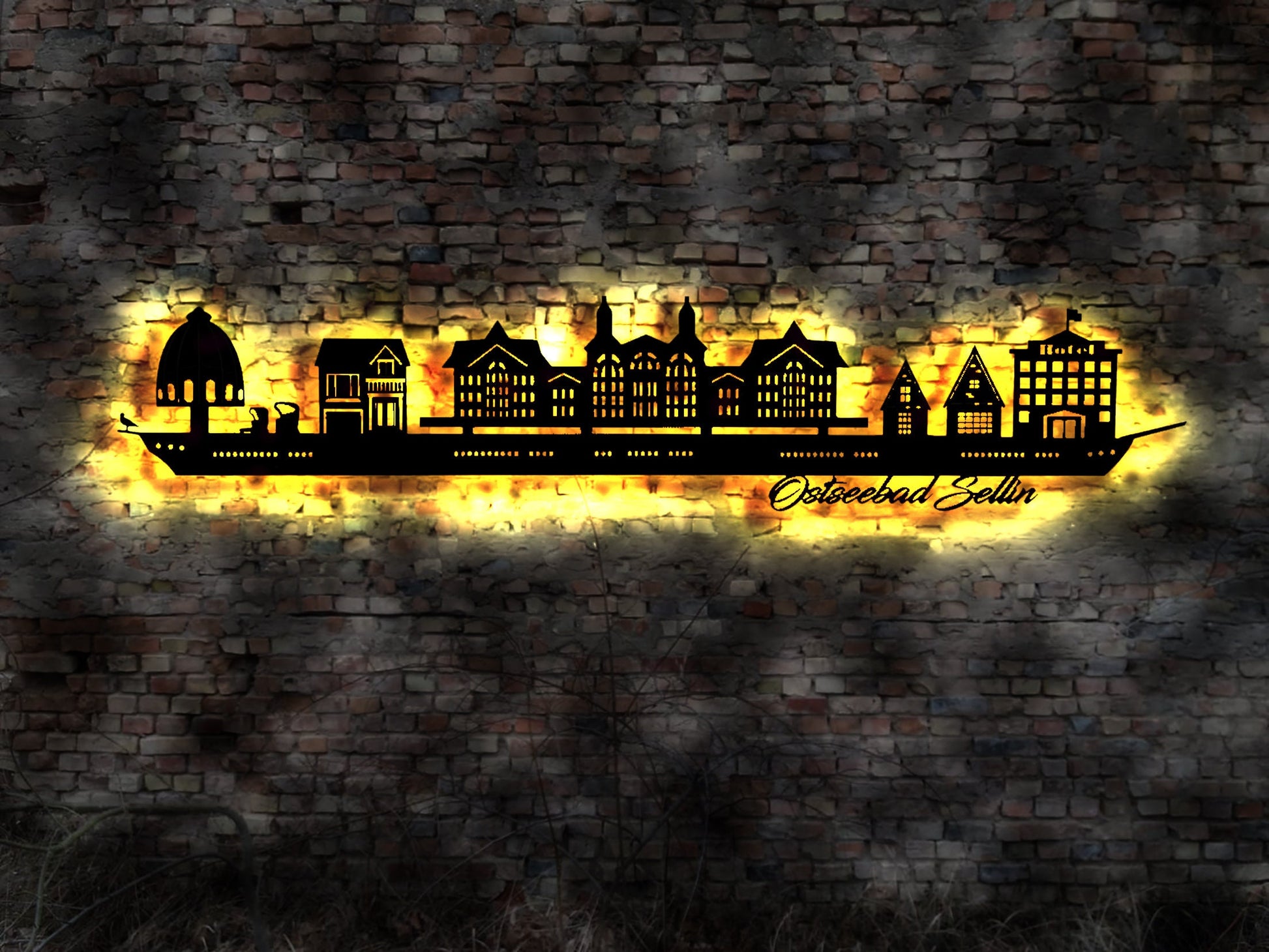 Skyline Ostseebad Sellin Wandbild Holz Stadt AK Karte Map Stadtplan Wandsticker Leuchtbild Wandtattoo Reiseführer Silhouette