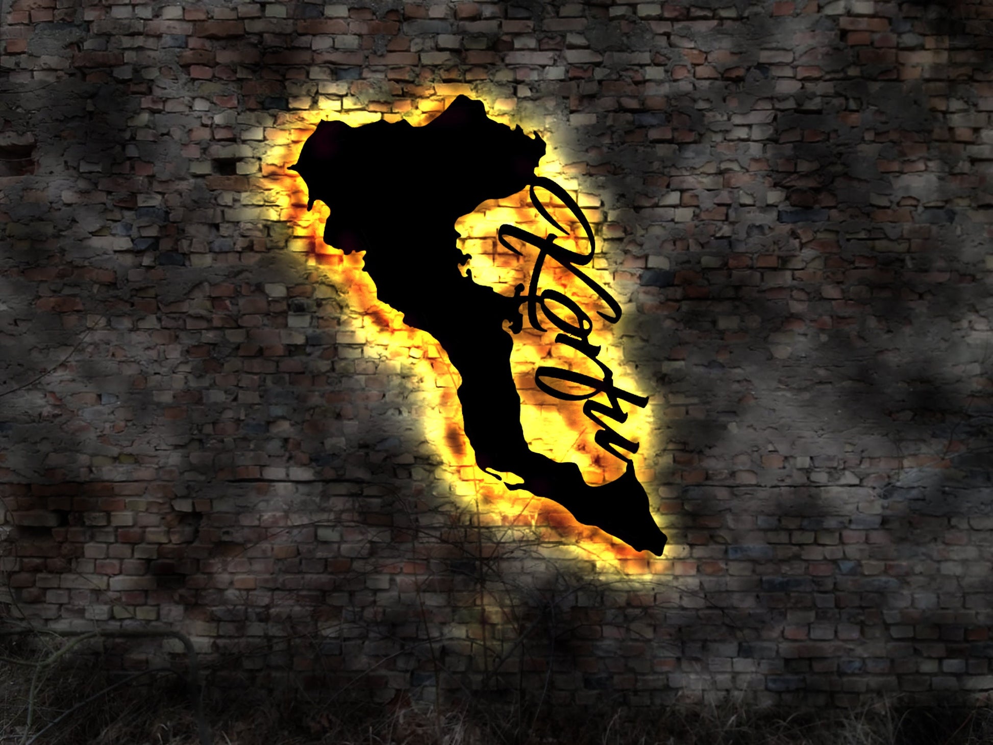 Das Wandbild hängt in einem Abstand von ca. 1 cm zur Wand, wodurch ein toller 3D-Effekt entsteht. Der warmweisse LED -Streifen hat 12 V und ist hinten im 90 Grad Winkel mit Schellen befestigt (geschraubt) , er kann bei Bedarf auch gewechselst werden.