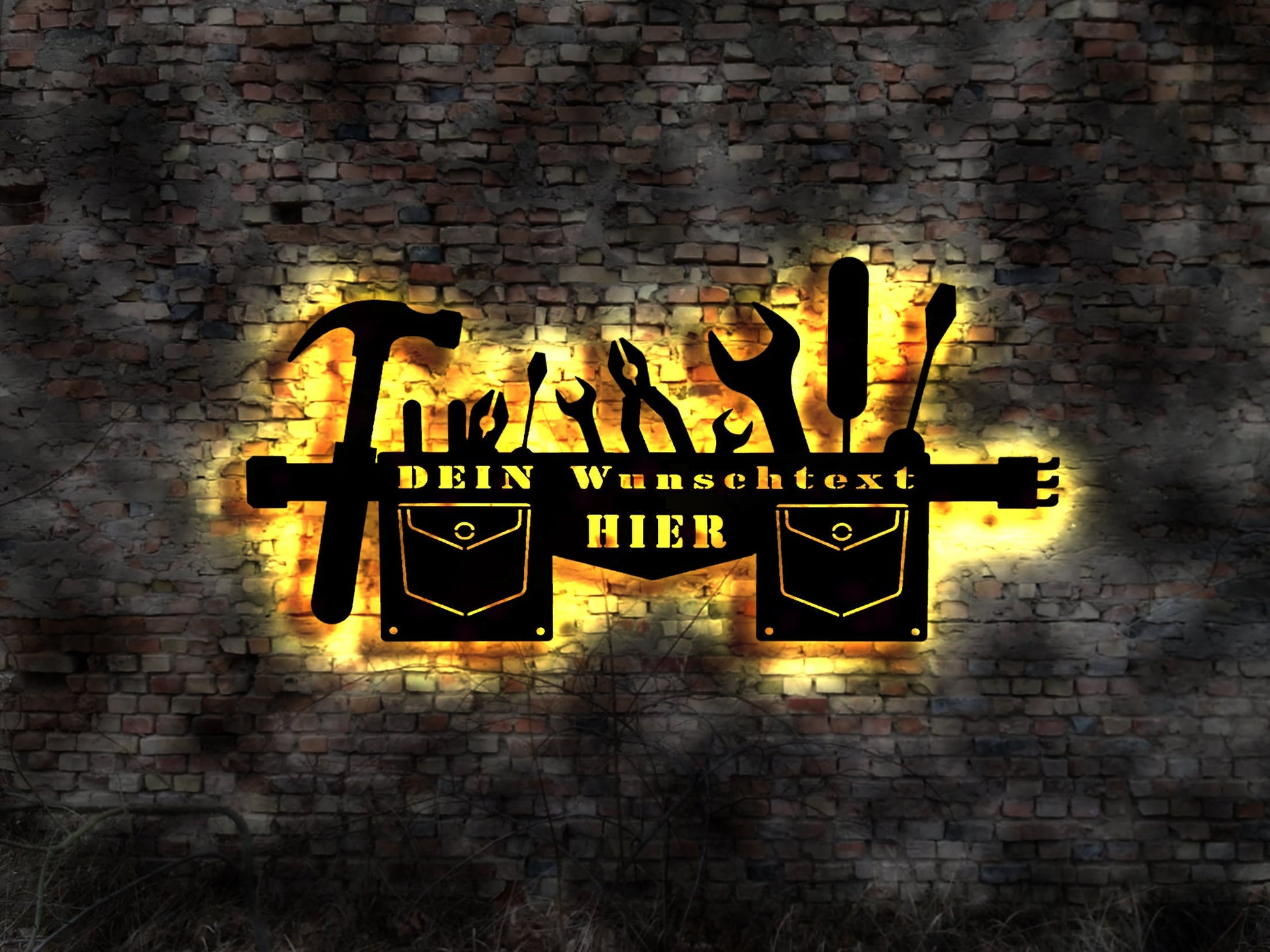 LED Wandbild Werkzeug Wunschtext Werkzeuggürtel individualisierbar Handwerker Werkstatt Werkzeugkasten Werkzeuge Säge Hammer Geselle