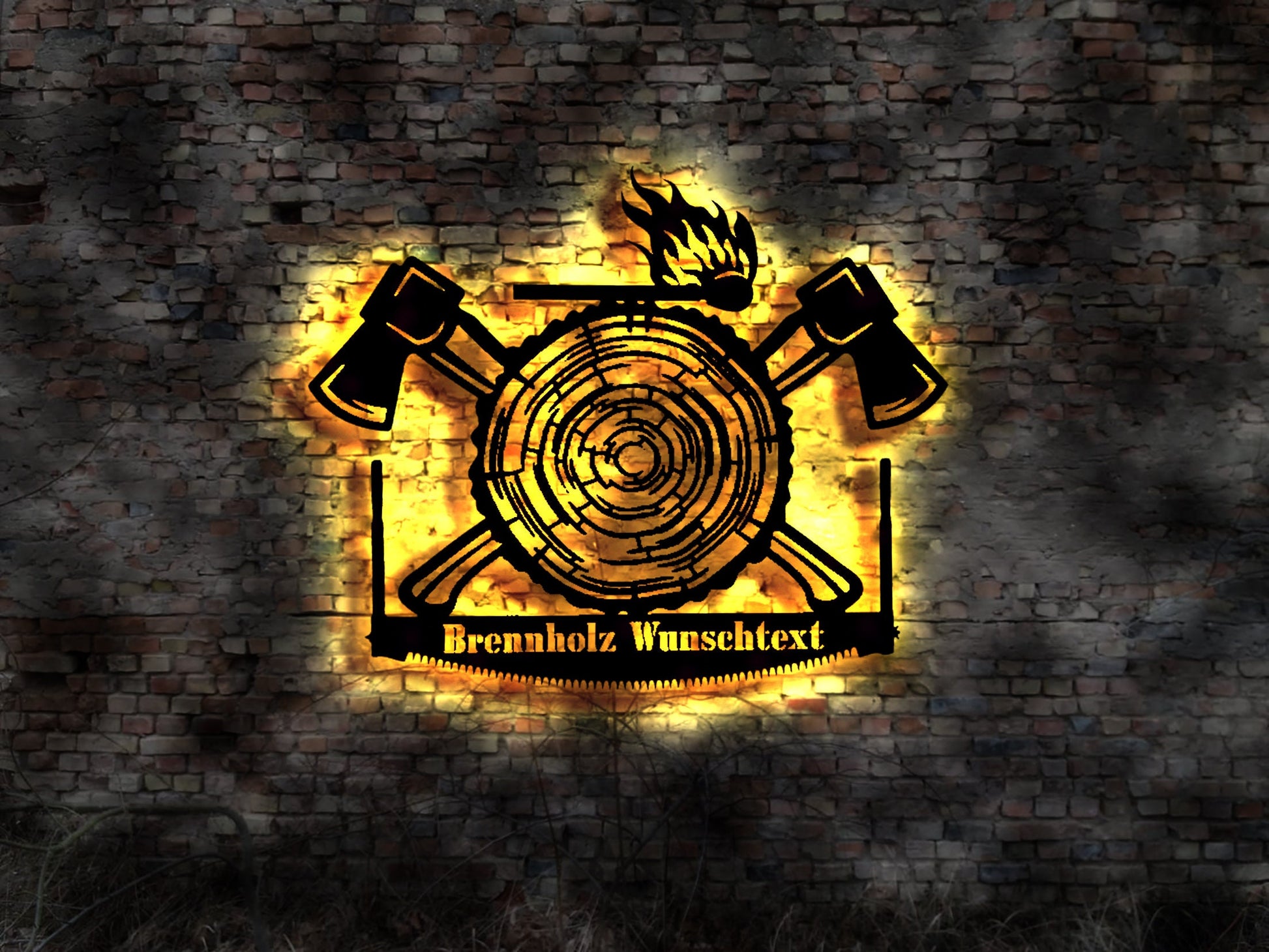 LED Wandbild Bild Silhouette Brennholz Holz machen Kaminofen Holzscheit Kettensäge Axt Beil Holzspalter Schild Baumscheibe