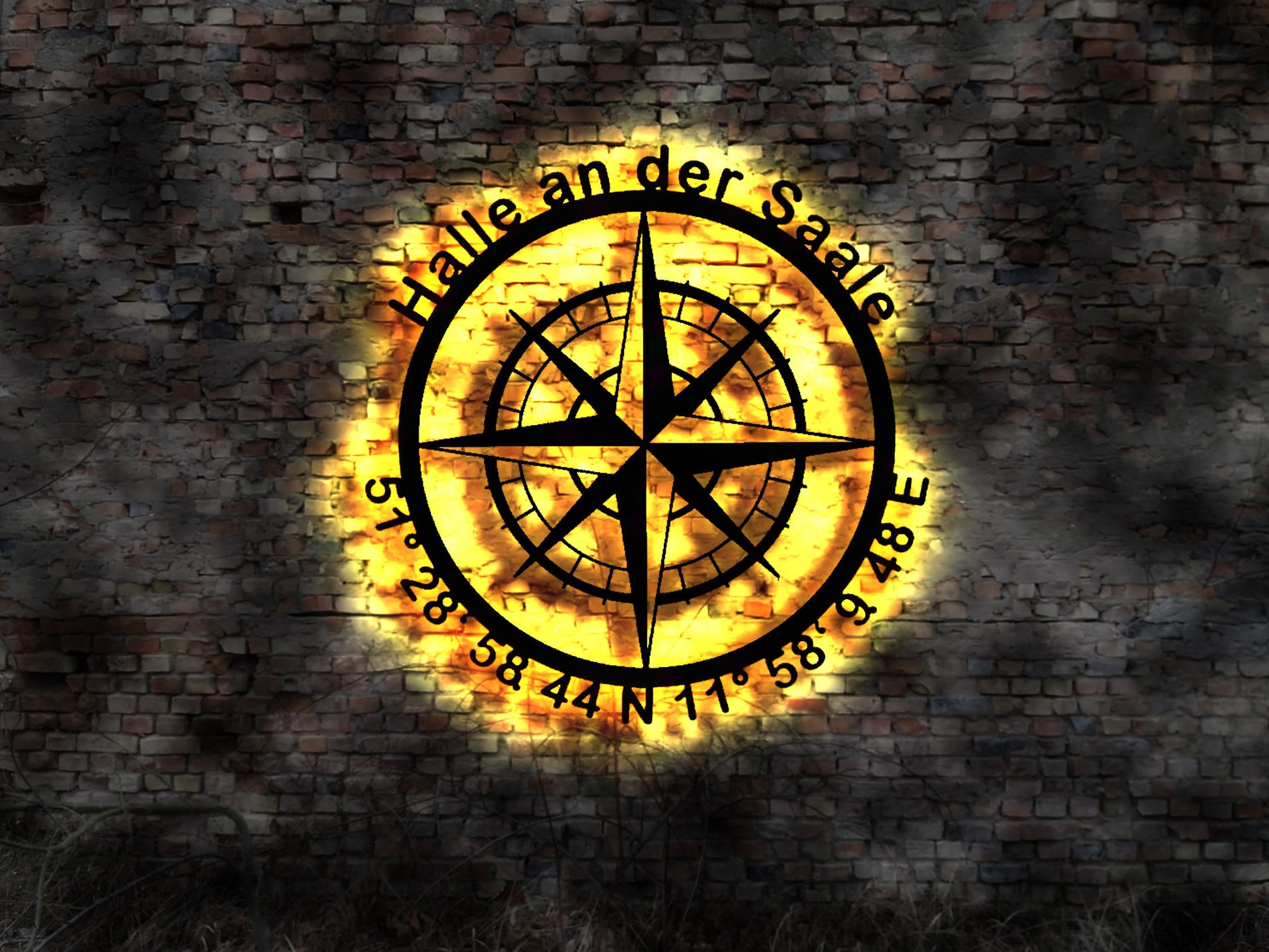 Halle an der Saale LED Wandbild Holz Stadt Karte Map Wandsticker Leuchtbild Geo-Koordinaten Wandtattoo Reiseführer Kompass GPS Koordinaten
