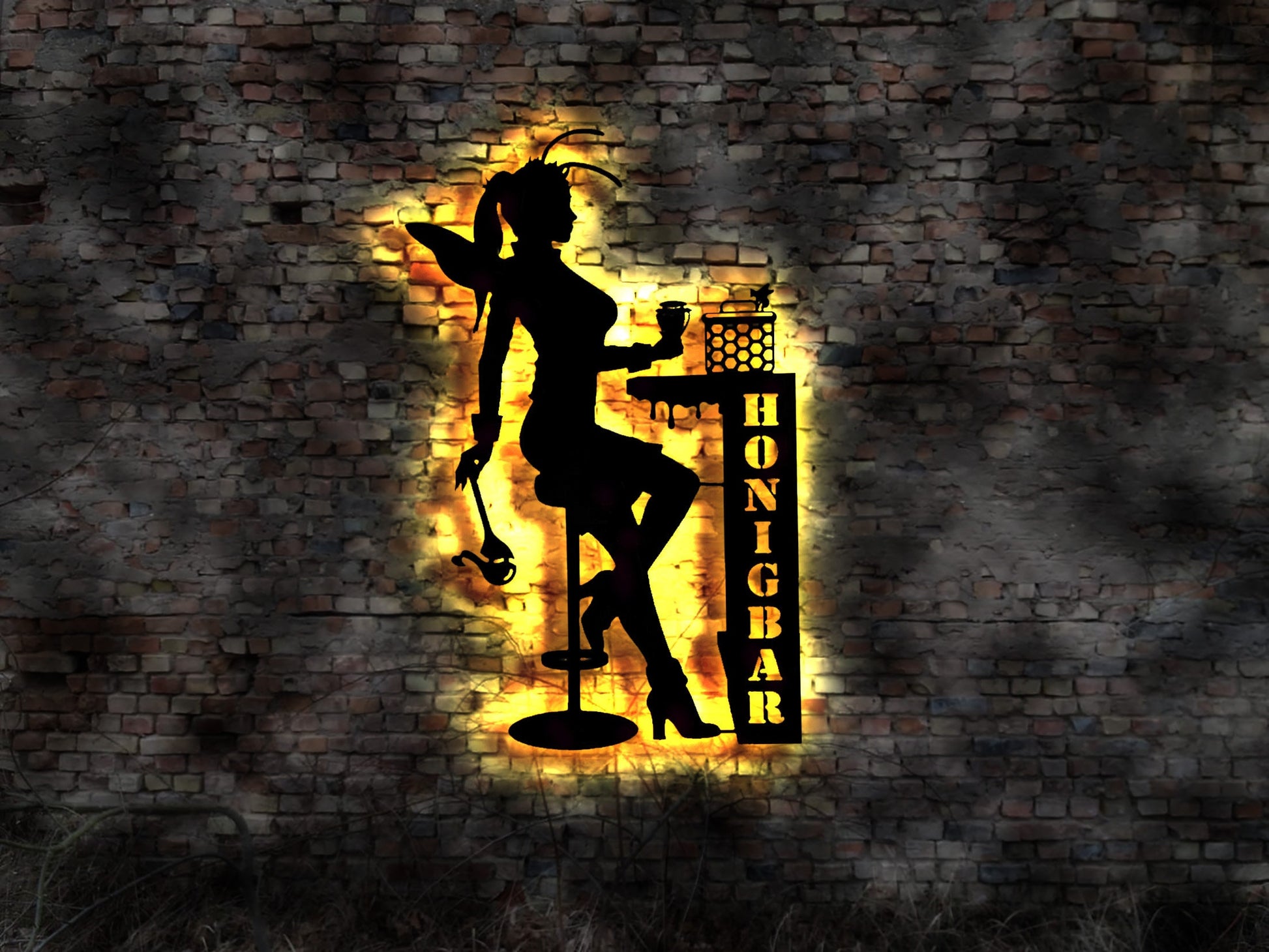 Made of wood. Sign will be hanged with a little distance to the wall.