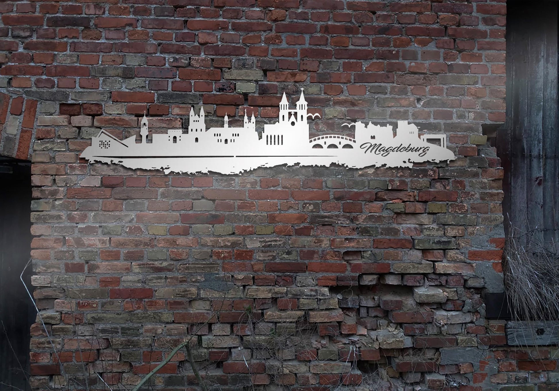 Edelstahl Skyline Stadt Magdeburg Wandkunst Stahl rostfrei Silhouette Metallkunst Künstlerarbeit