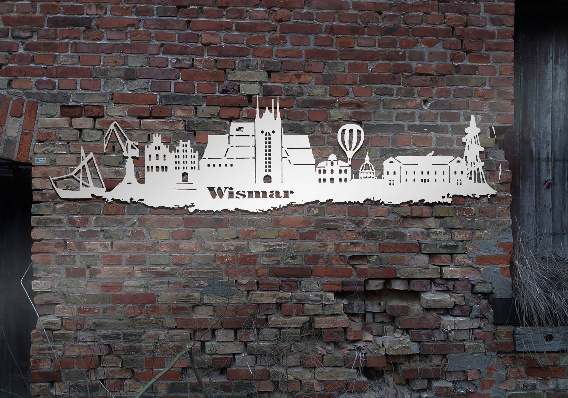 Skyline Metall Wismar Hafen Schild Stahl rostfrei Metallkunst Schild Cortenstahl rostend rostig verrostet Corten
