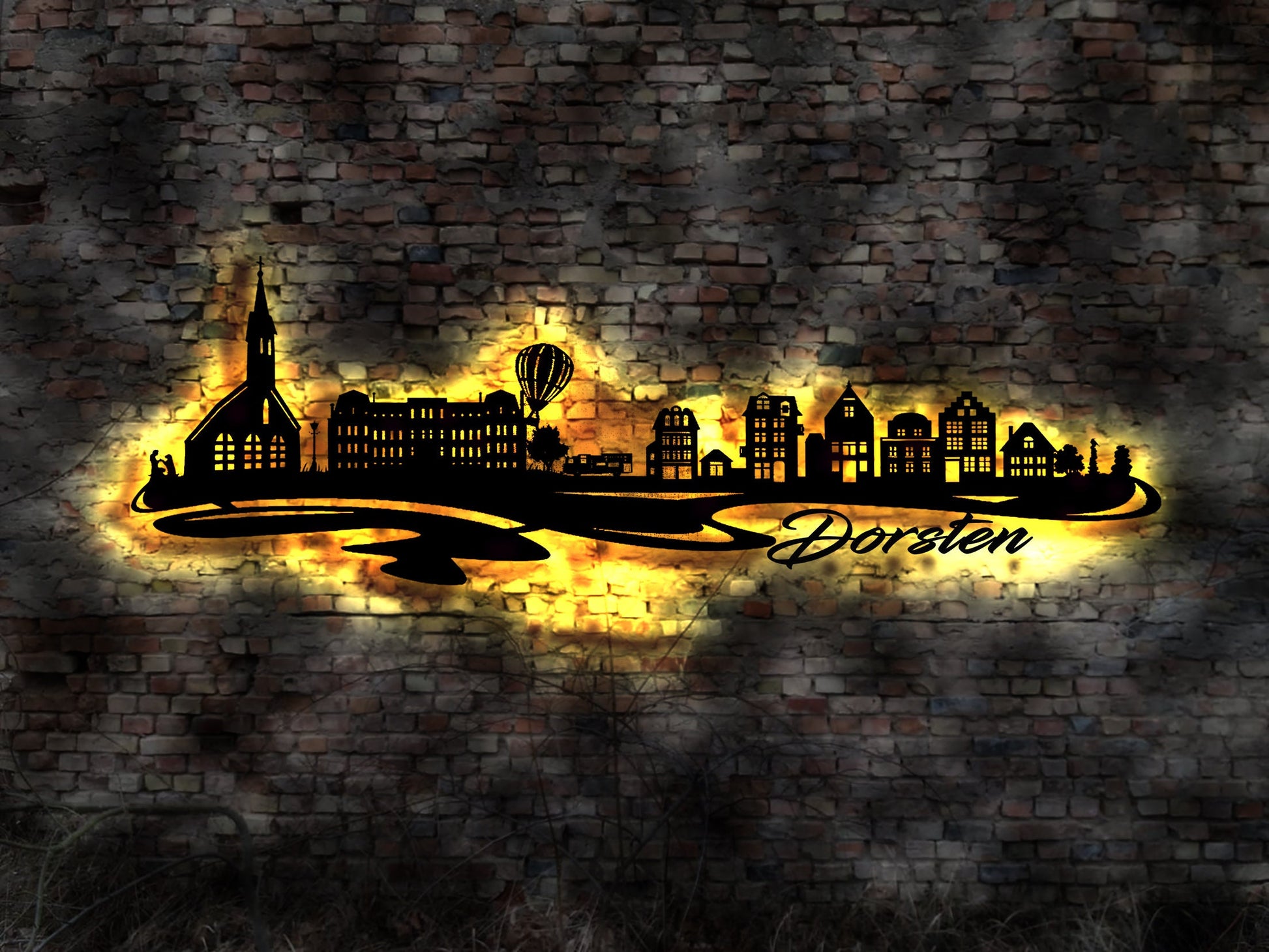 Skyline Dorsten LED Wandbild Holz Stadt AK Karte Map Stadtplan Wandsticker Leuchtbild Neonreklame Wandtattoo Reiseführer Silhouette