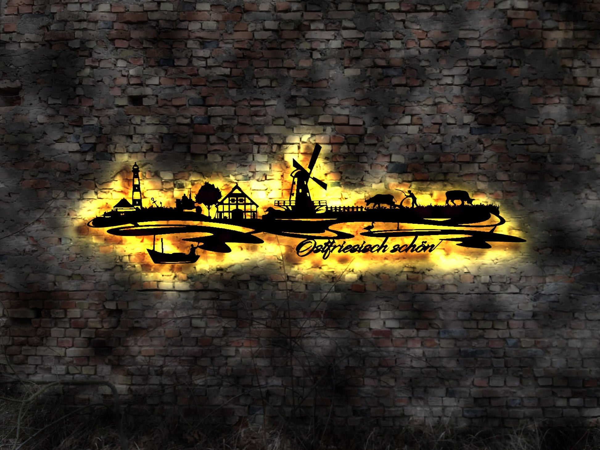 Skyline Nordsee osfriesisch LED Wandbild Holz Stadt AK Karte Map Wandsticker Leuchtbild Neonreklame Wandtattoo Reiseführer Silhouette