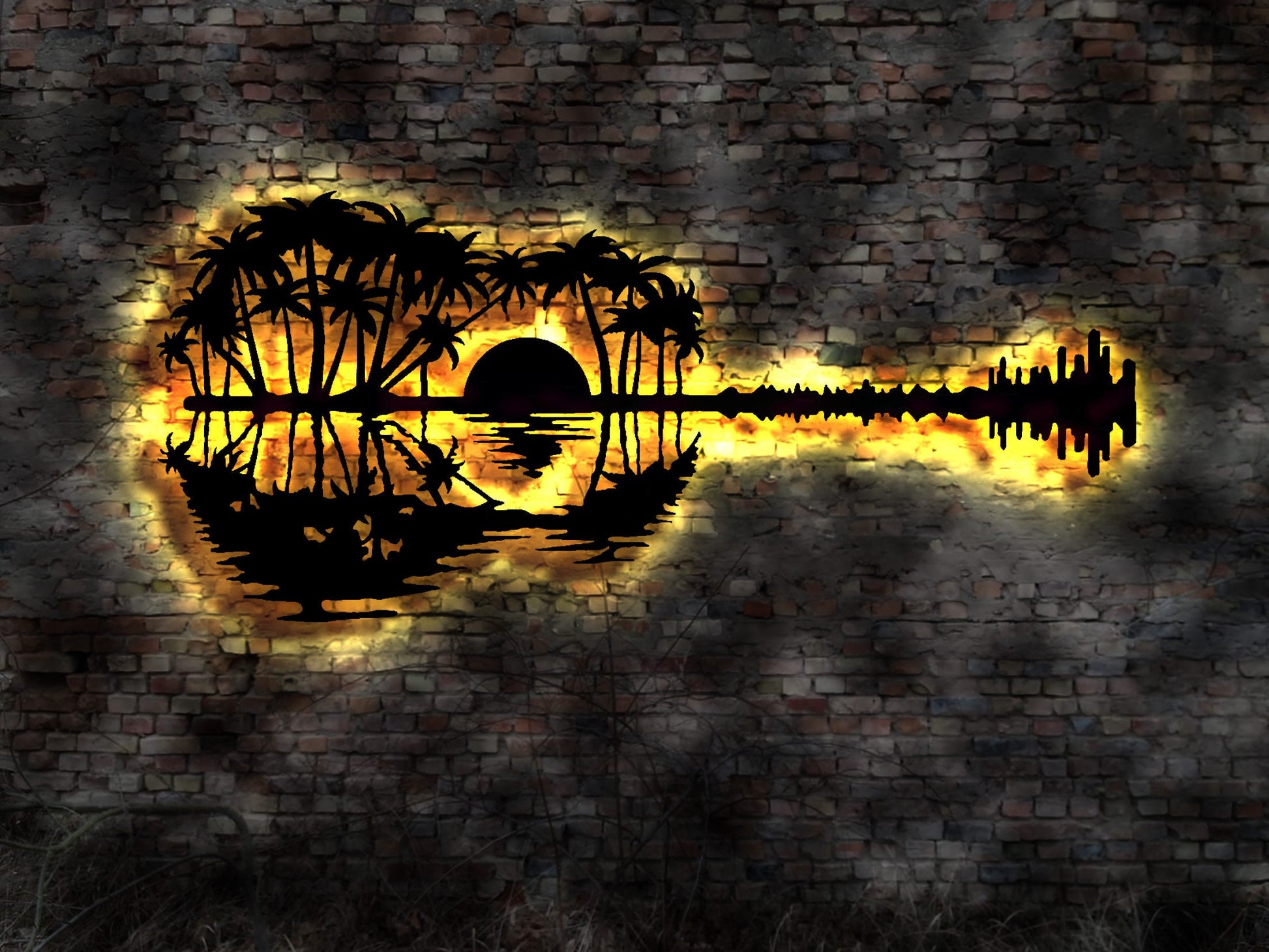 Das Wandbild hängt in einem Abstand von ca. 1 cm zur Wand, wodurch ein toller 3D-Effekt entsteht. Der warmweisse LED -Streifen hat 12 V und ist hinten im 90 Grad Winkel mit Schellen befestigt (geschraubt) , er kann bei Bedarf auch gewechselst werden.