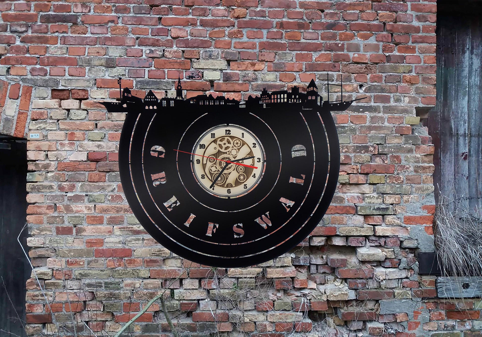 Greifswald Wanduhr Uhr Holzuhr Uhren Ziffernblatt Clock Holz Armbanduhr Skyline Silhouette Rostock Aufkleber
