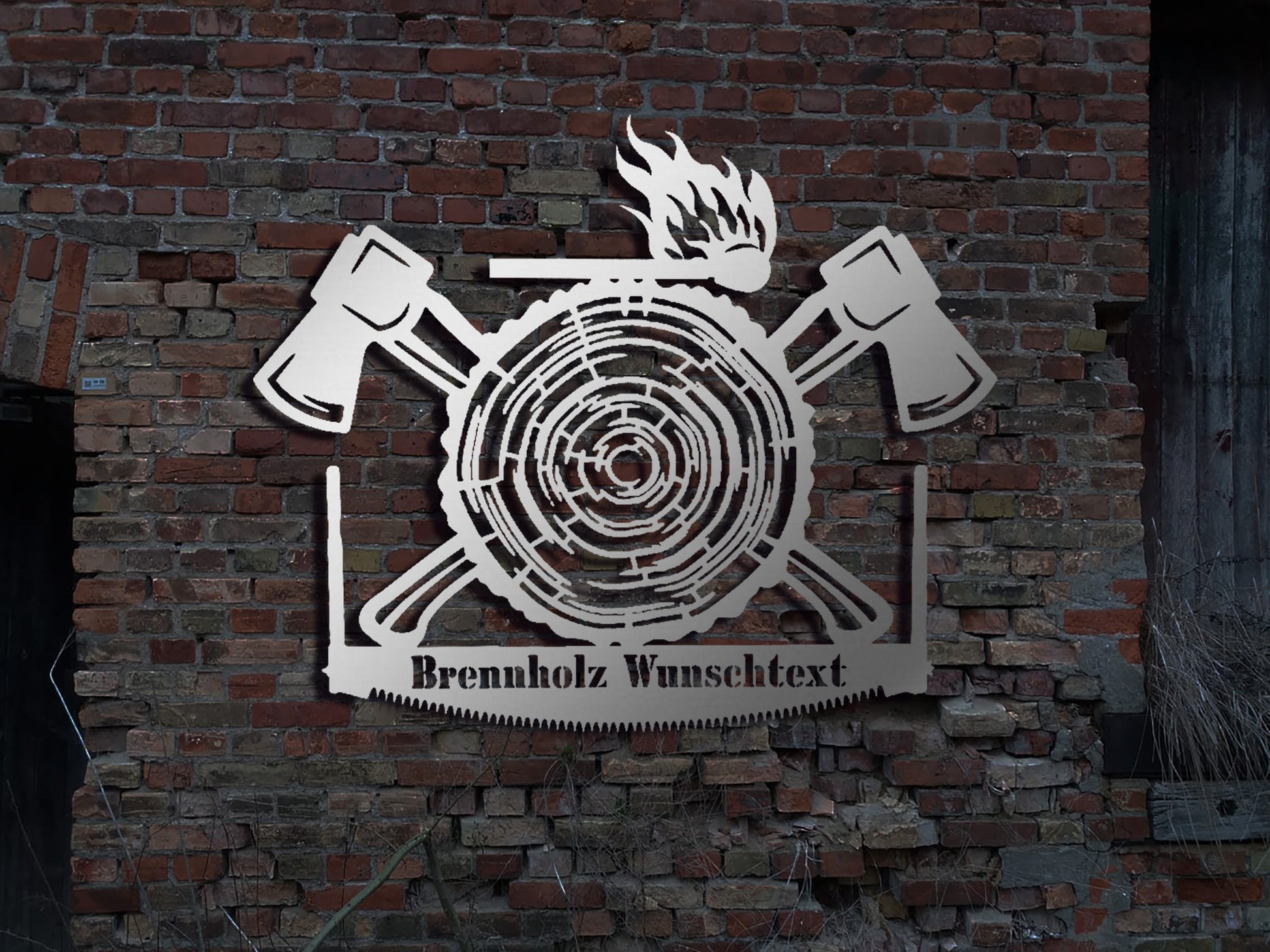 Edelstahl Wandbild Schild Brennholz Holzspalter Kettensäge Holzscheit Buche SRM Kaminholz sign Metallschild Stahlschild