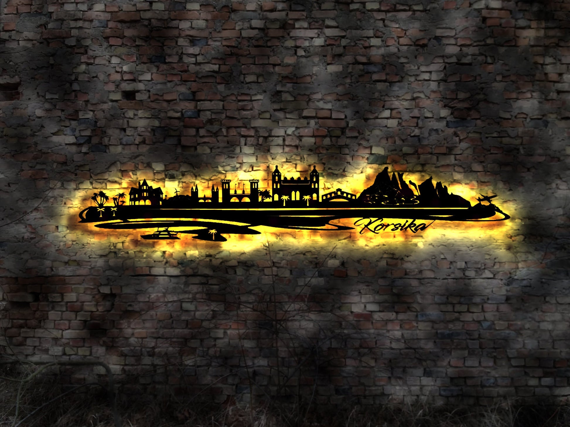 Skyline Korsika Insel Urlaub LED Wandbild Holz Stadt AK Karte Map Wandsticker Leuchtbild Neonreklame Wandtattoo Reiseführer Silhouette