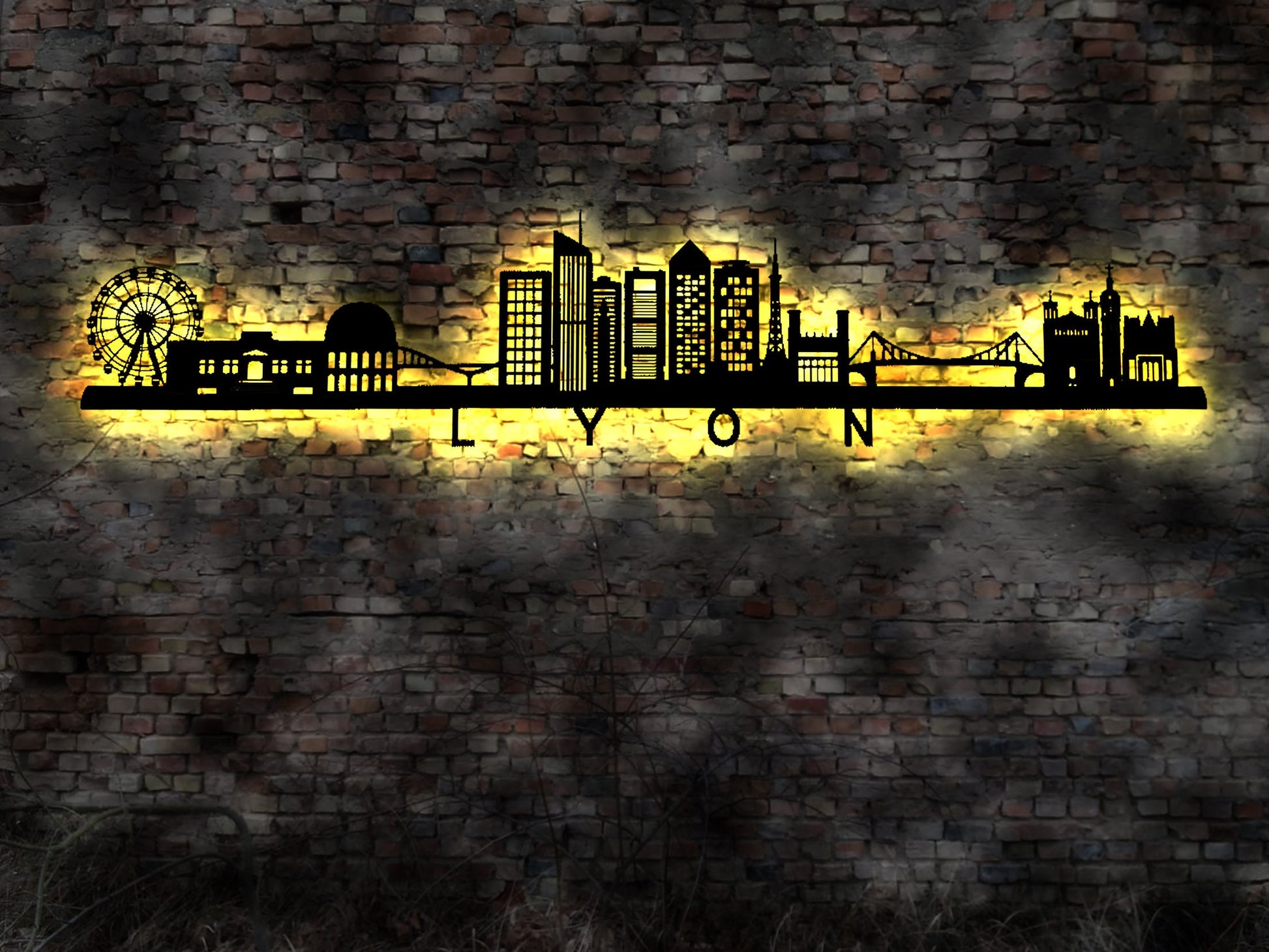 Skyline Lyon France Frankreich LED Wandbild Holz Stadt AK Karte Map Stadtplan Wandsticker Leuchtbild Neonreklame Wandtattoo Silhouette