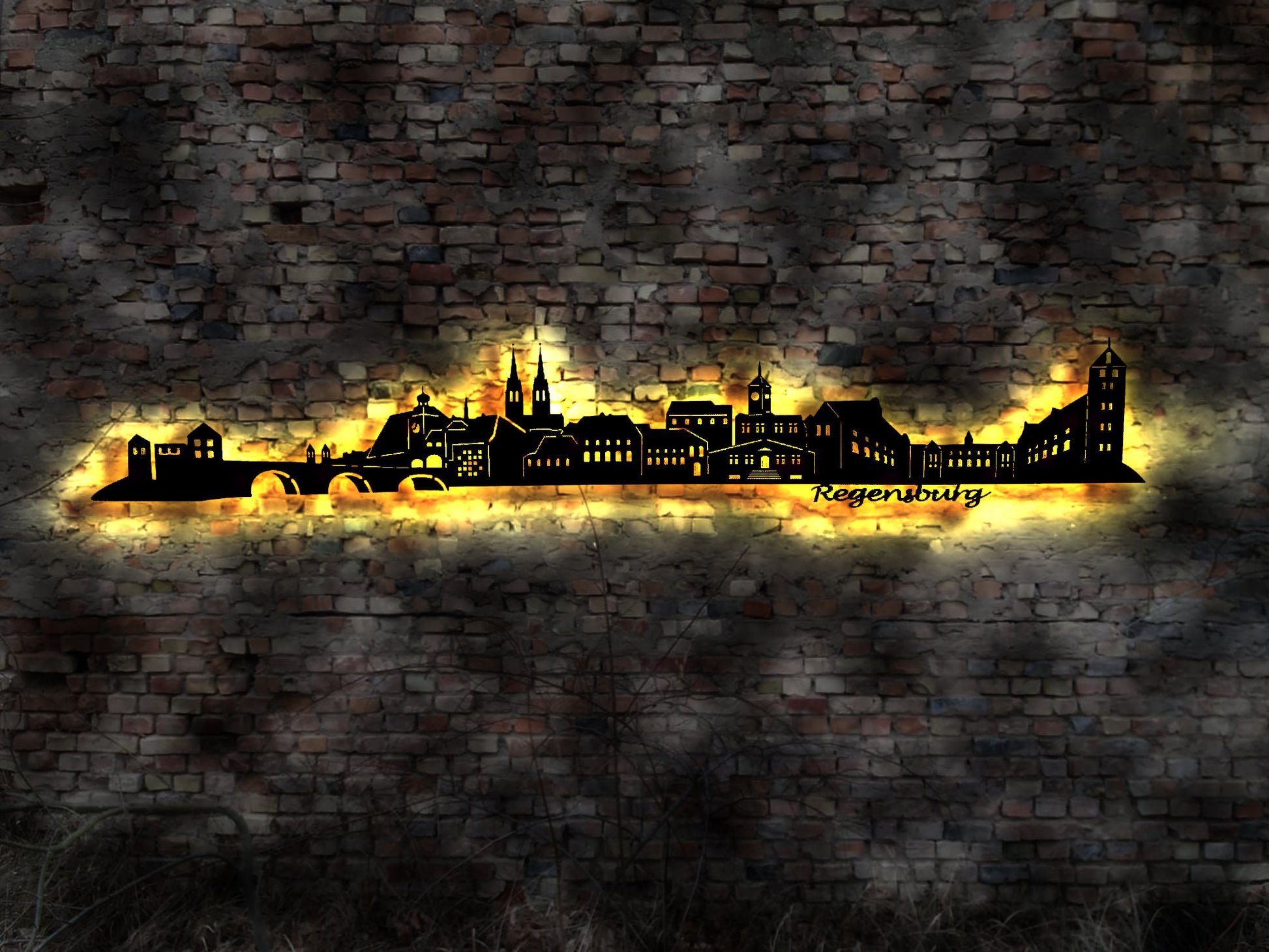 Skyline Regensburg LED Wandbild Holz Stadt AK Karte Map Stadtplan Wandsticker Leuchtbild Neonreklame Wandtattoo Reiseführer Silhouette