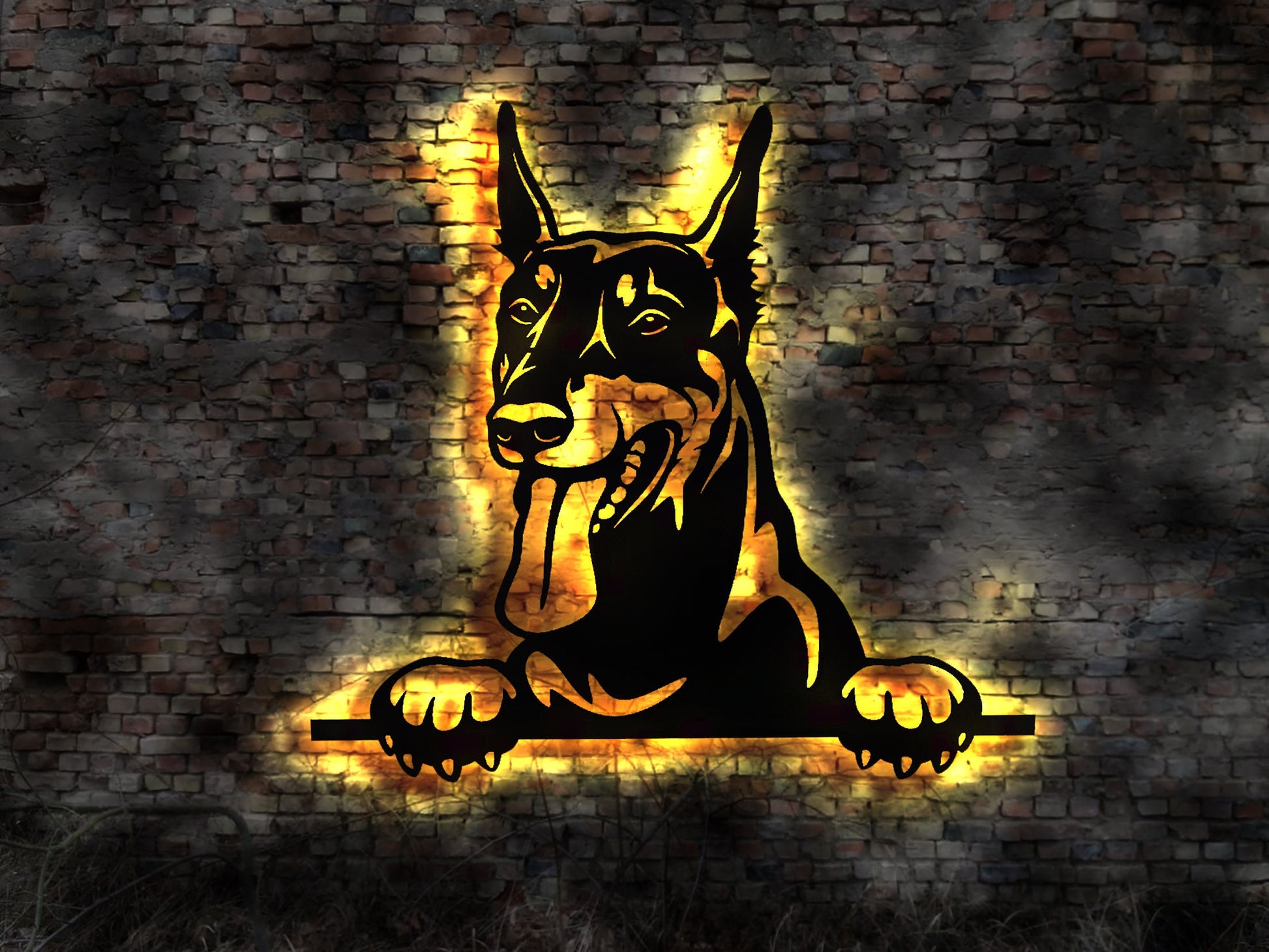 Dobermann LED Wandbild aus Holz Welpen Welpe Buch Hund Dog Zucht Züchter Geschirr Futternapf Leine Leckerlies Halsband Security Emblem
