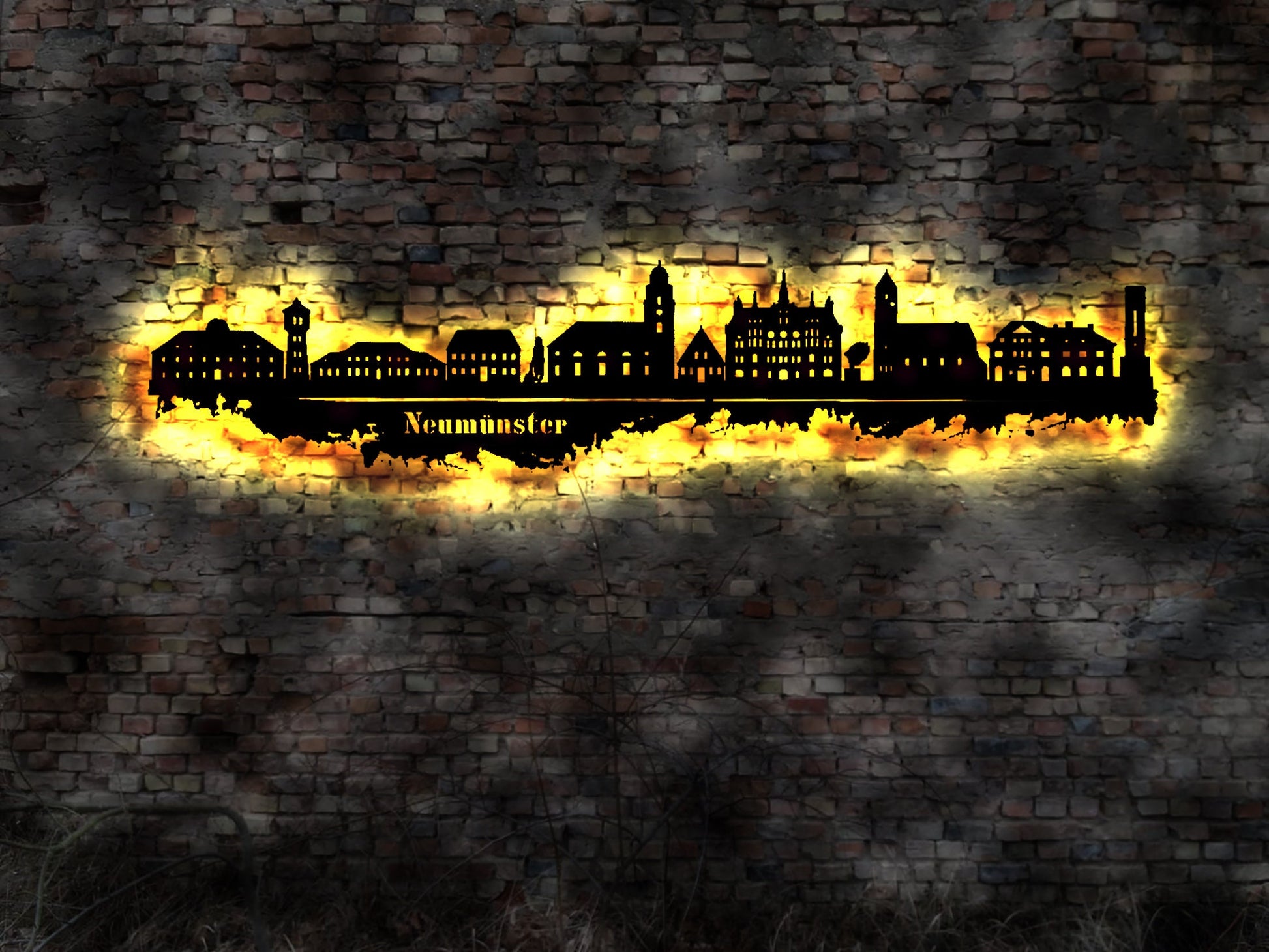 Skyline Neumünster LED Wandbild Holz Stadt AK Karte Map Stadtplan Wandsticker Leuchtbild Neonreklame Wandtattoo Reiseführer Silhouette