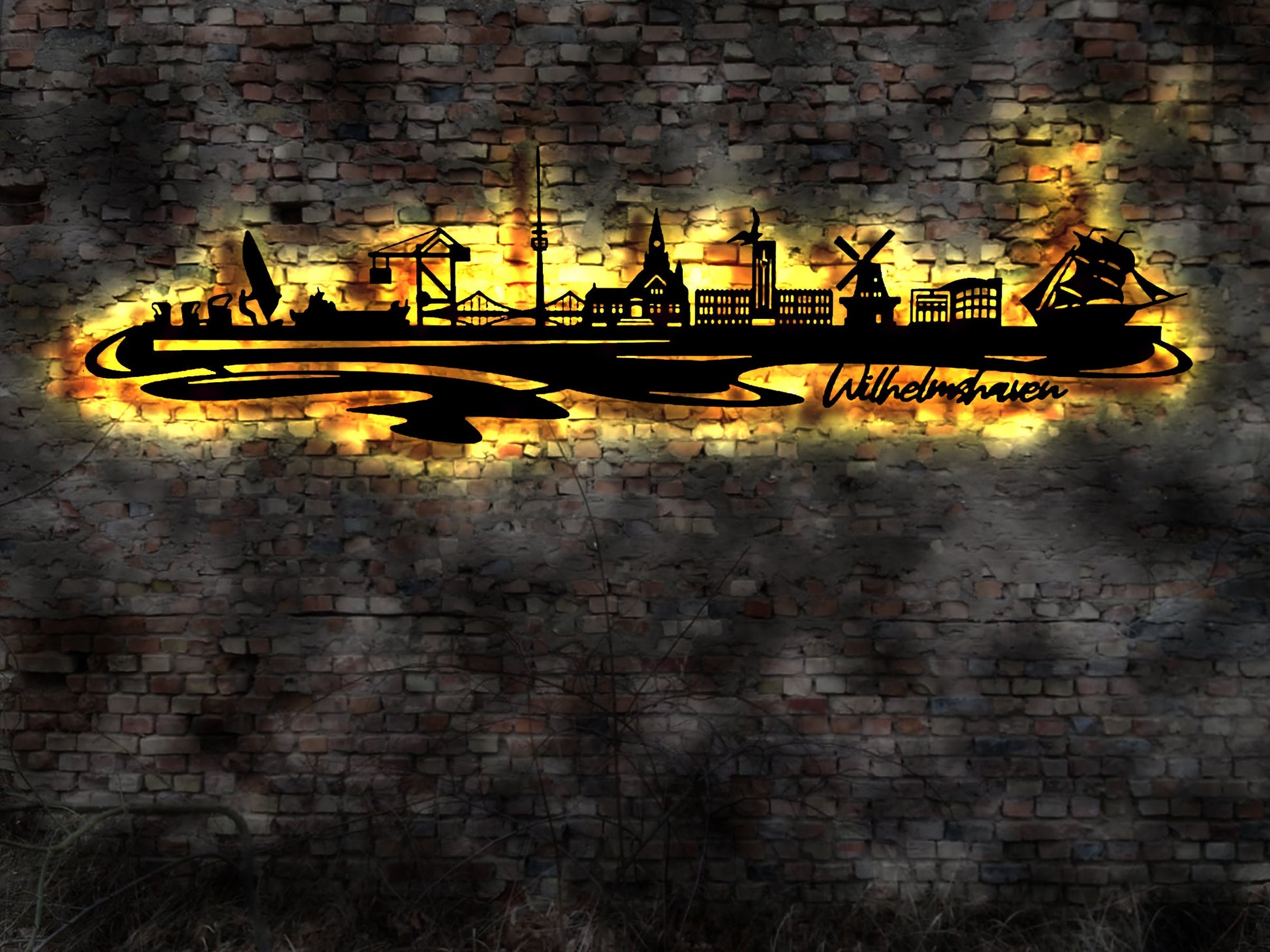 Skyline Wilhelmshaven LED Wandbild Holz Stadt AK Karte Map Stadtplan Wandsticker Leuchtbild Neonreklame Wandtattoo Reiseführer Silhouette