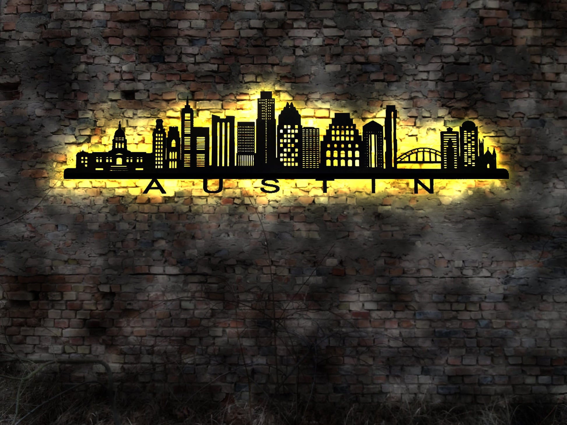 Skyline Austin USA LED Wandbild Holz Stadt AK Karte Map Stadtplan Wandsticker Leuchtbild Neonreklame Wandtattoo Silhouette