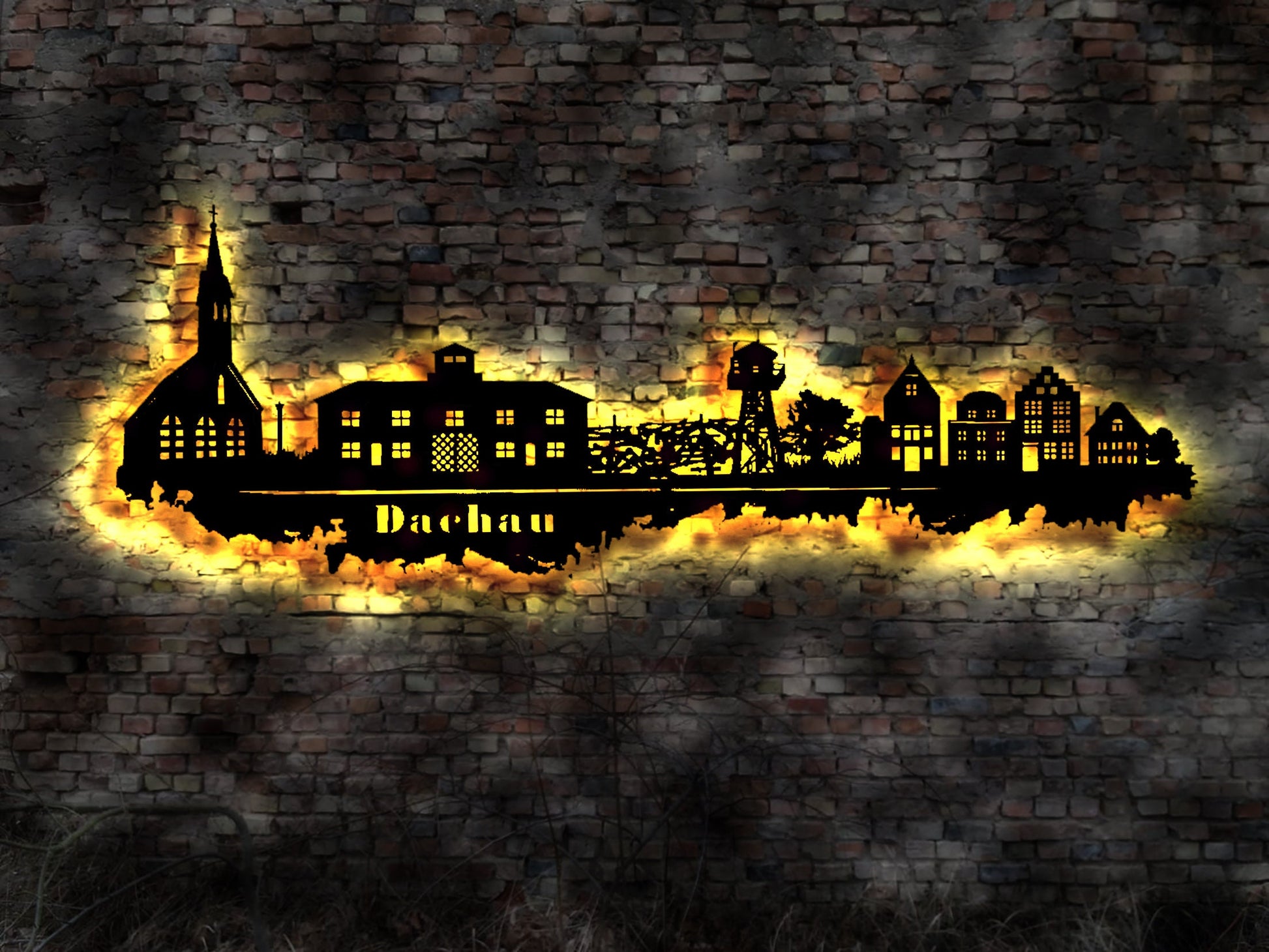 Skyline Stadt Dachau LED Wandbild Holz Mahnmal Gedenkstätte Stadtplan Wandsticker Leuchtbild Wandtattoo Reiseführer Silhouette