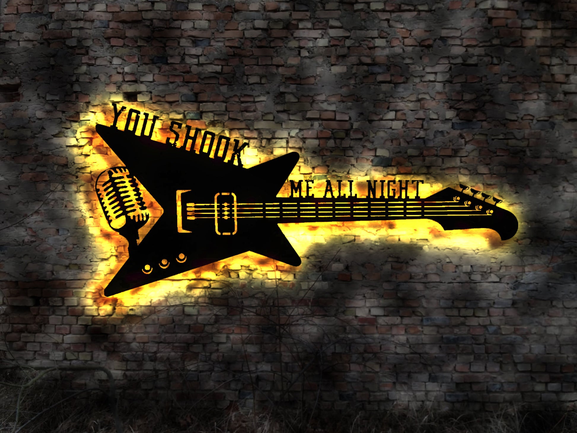 LED Leuchtschild You Shook me All Night Gitarre Guitar Leuchtreklame Schild Neonreklame sign Wunschtext Anfertigung nach Wunsch Holzschild