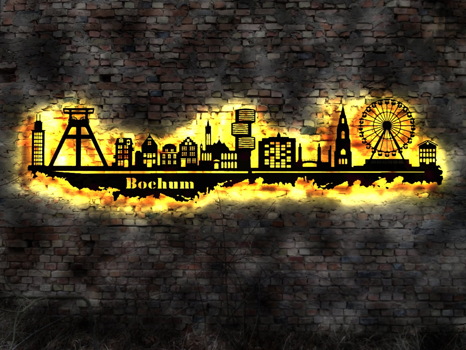 Skyline Bochum Wandbild Holz Stadt AK Karte Map Stadtplan Wandsticker Leuchtbild Neonreklame Wandtattoo Reiseführer Silhouette