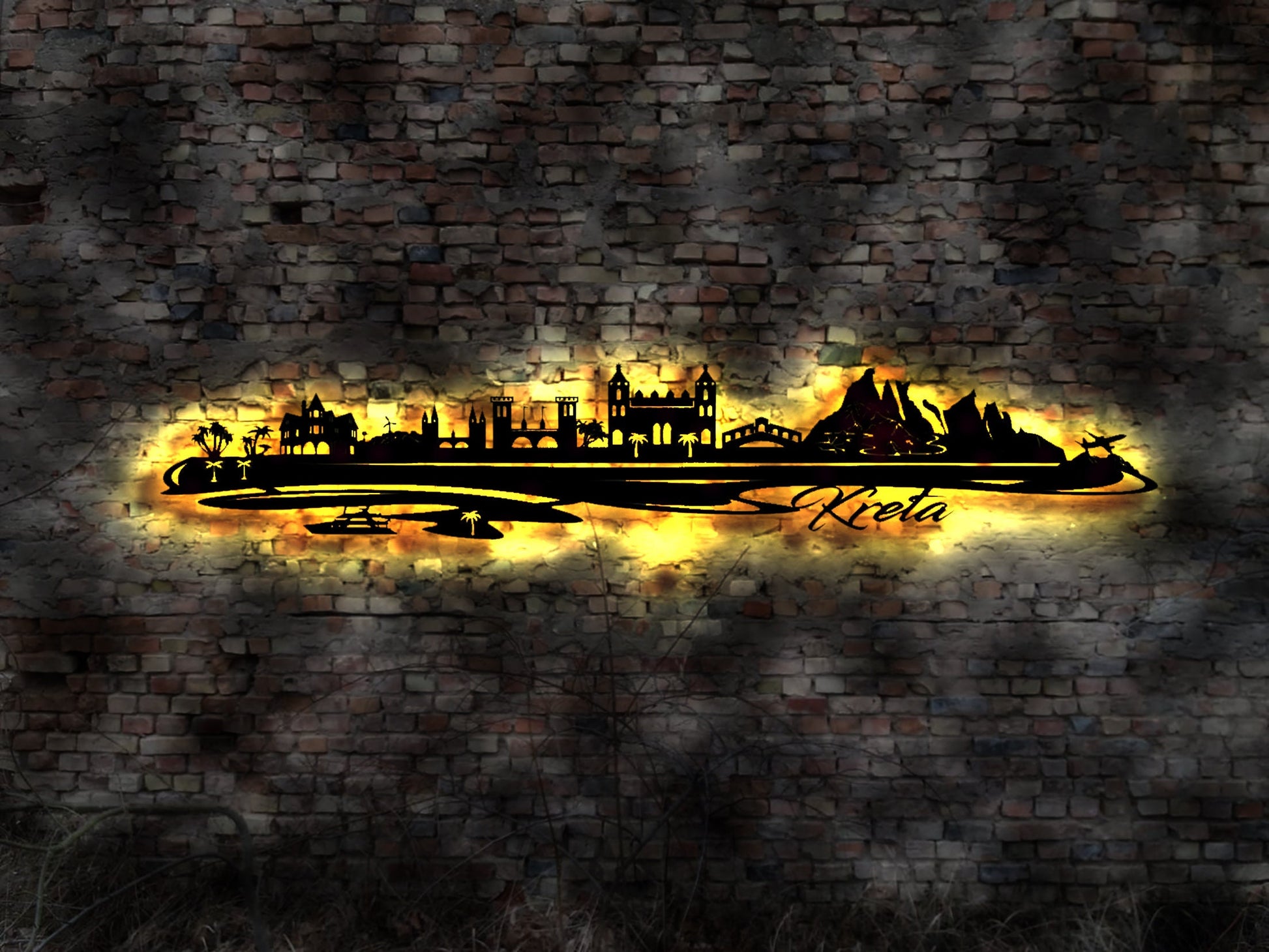 Skyline Kreta Insel Urlaub LED Wandbild Holz Stadt AK Karte Map Wandsticker Leuchtbild Neonreklame Wandtattoo Reiseführer Silhouette