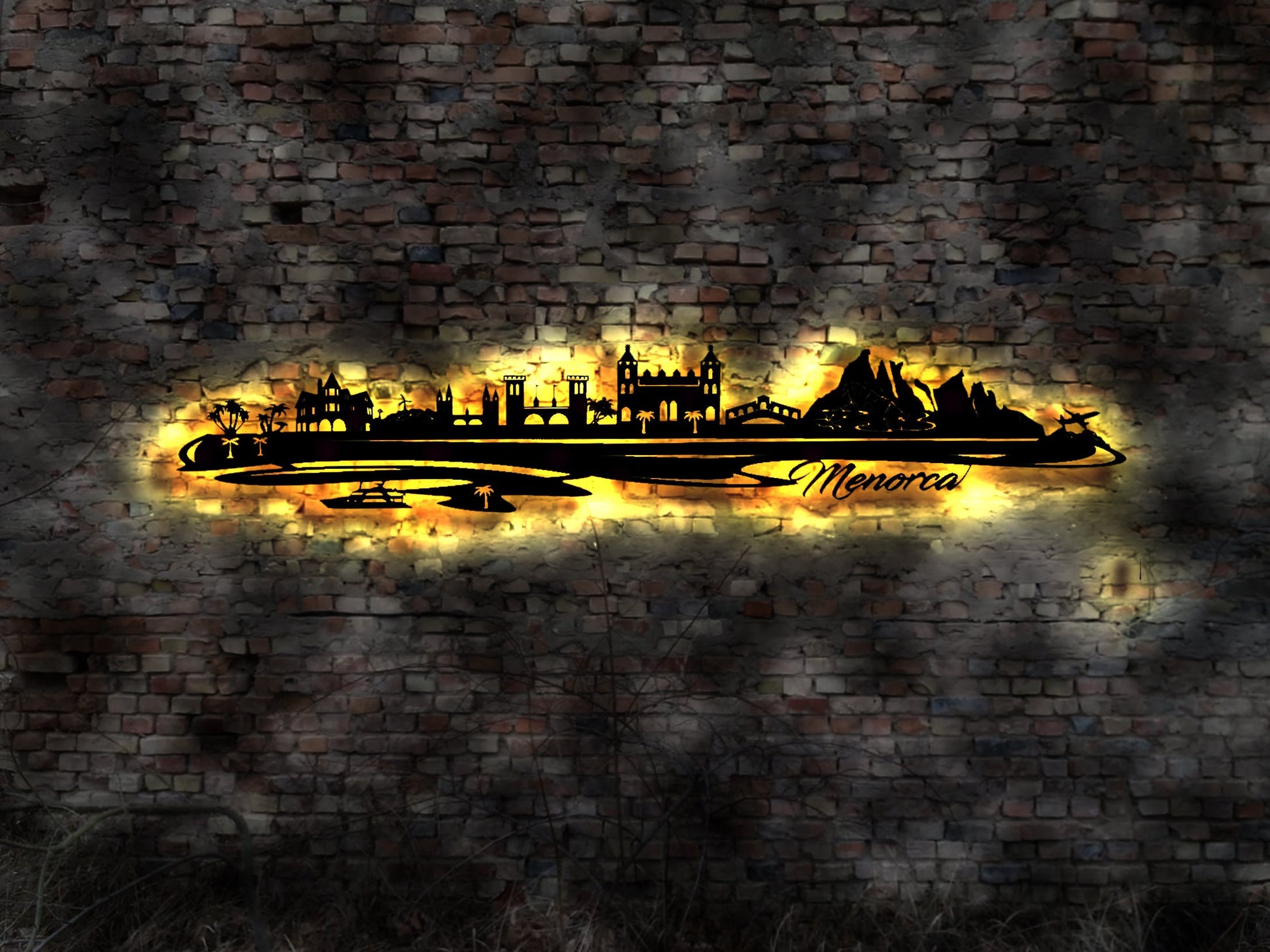 Skyline Insel Menorca LED Wandbild Holz Stadt AK Karte Map Wandsticker Leuchtbild Neonreklame Wandtattoo Reiseführer Silhouette