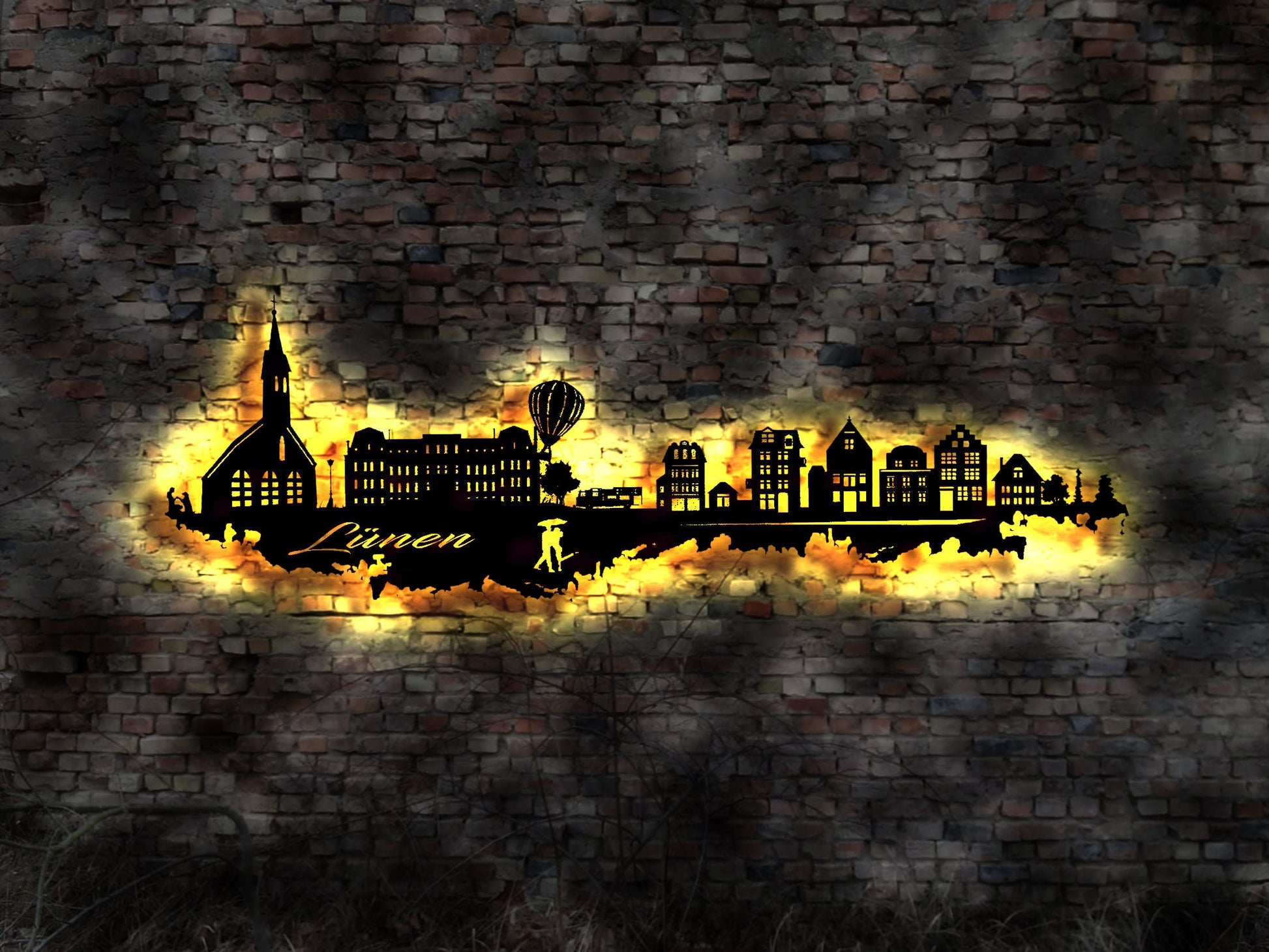 Skyline Lünen LED Wandbild Holz Stadt AK Karte Map Stadtplan Wandsticker Leuchtbild Neonreklame Wandtattoo Reiseführer Silhouette