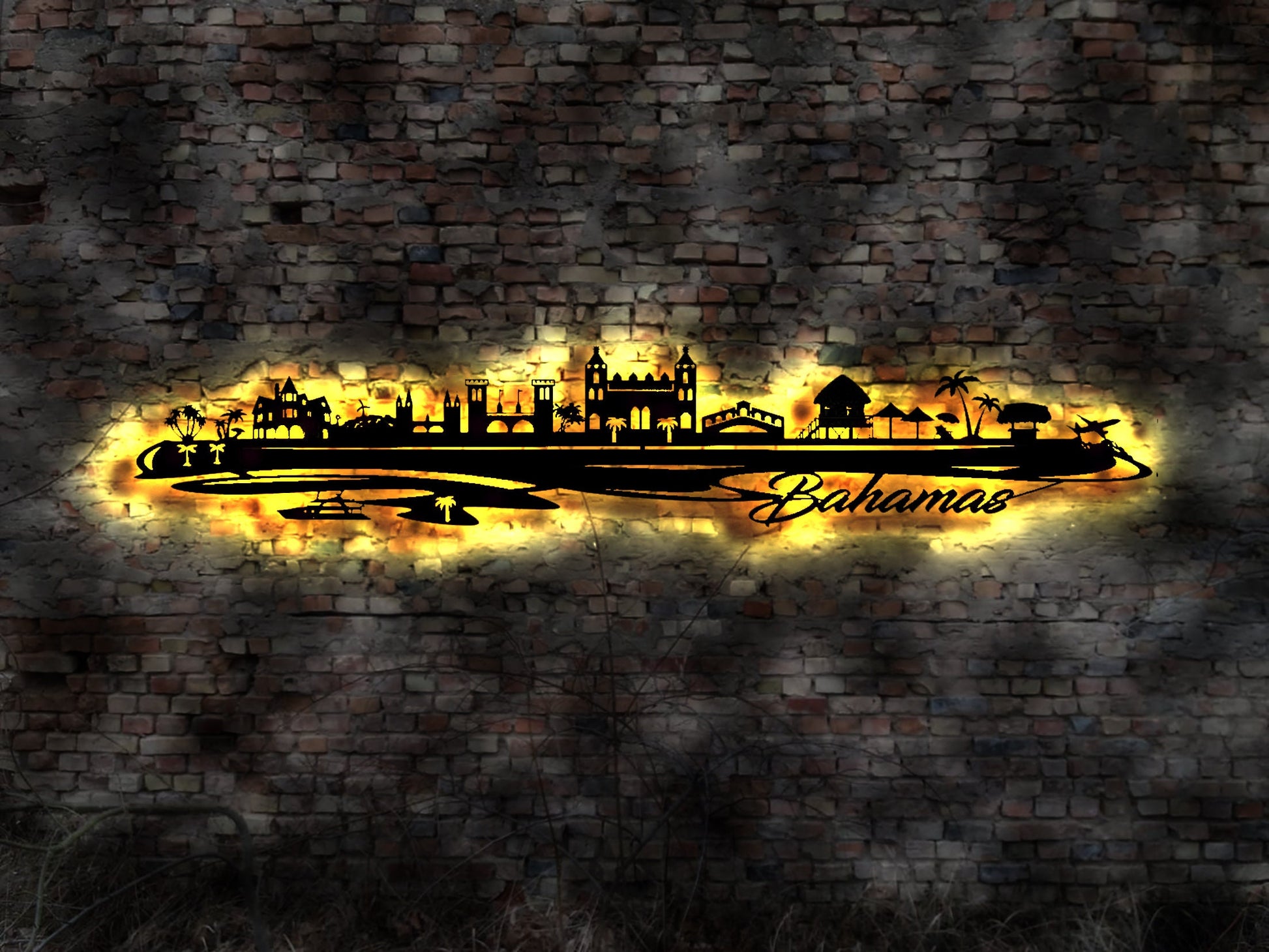 Skyline Bahamas Island Urlaub LED Wandbild Holz Stadt AK Karte Map Wandsticker Leuchtbild Neonreklame Wandtattoo Reiseführer Silhouette