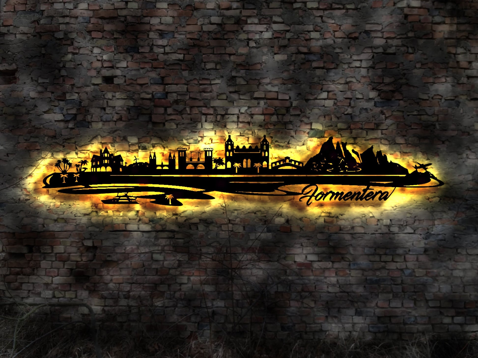 Skyline Formentera Island Urlaub LED Wandbild Holz Stadt AK Karte Map Wandsticker Leuchtbild Neonreklame Wandtattoo Reiseführer Silhouette