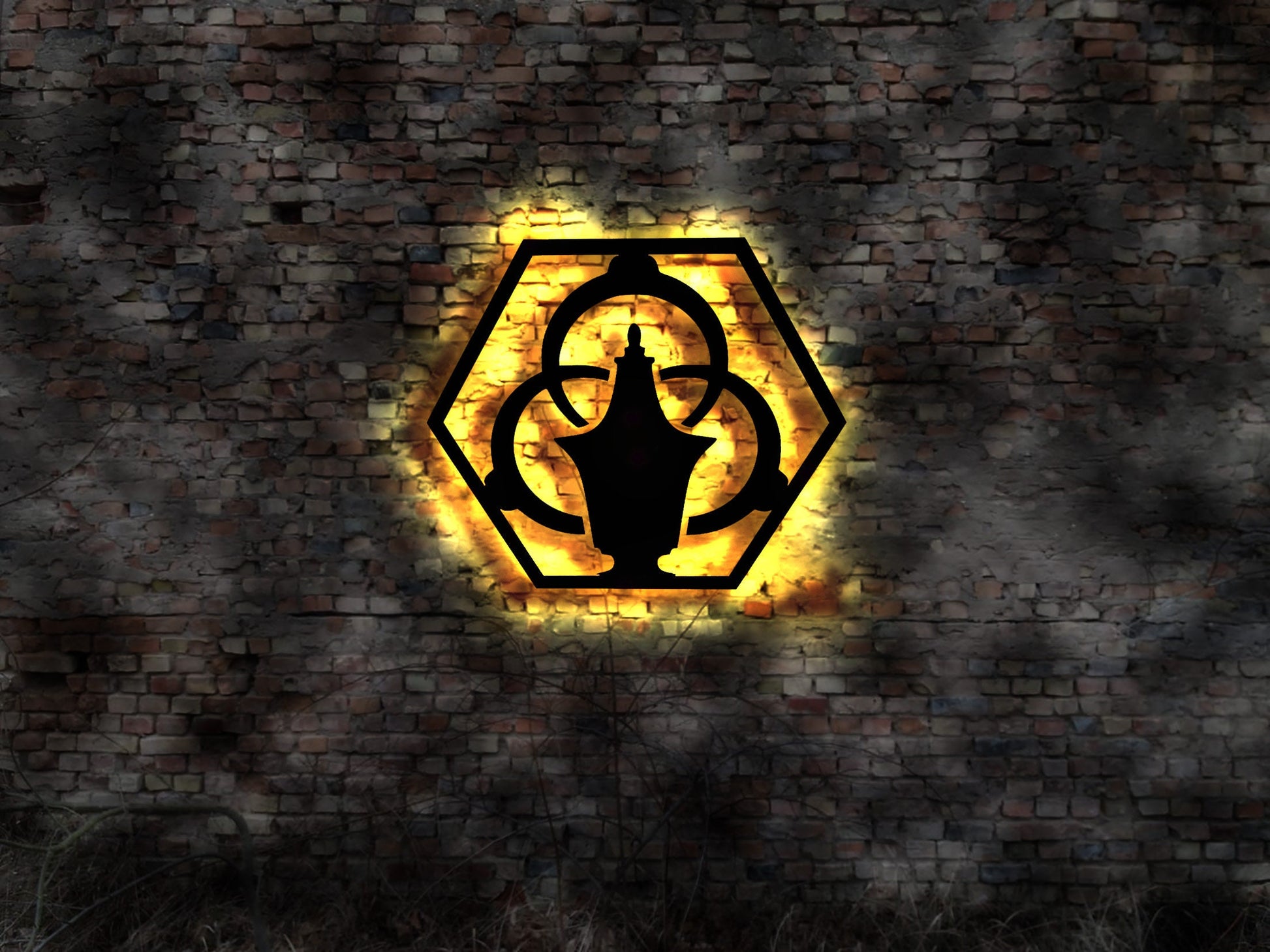 Made of wood. Sign will be hanged with a little distance to the wall.