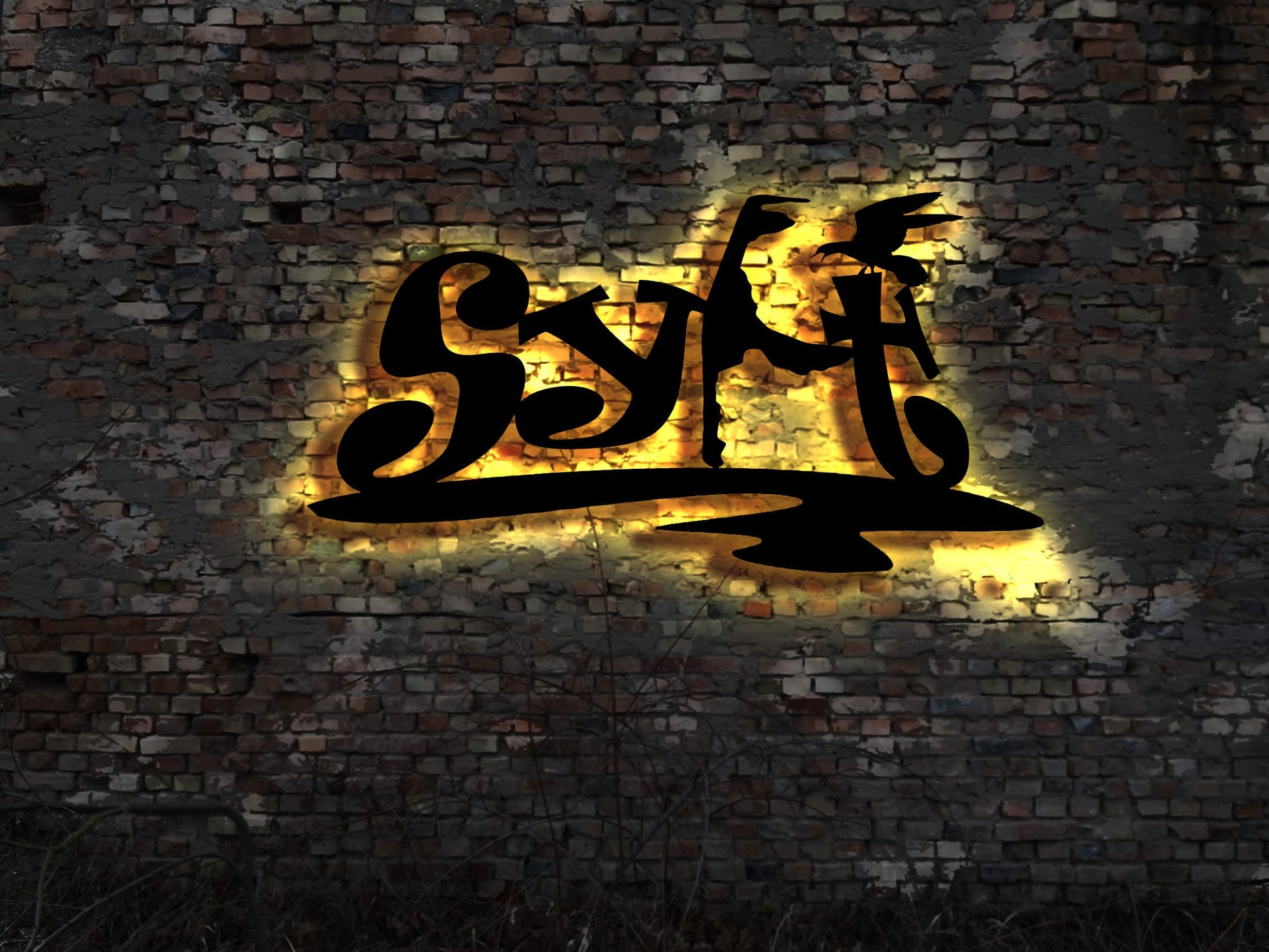 Made of wood. Sign will be hanged with a little distance  to the wall.